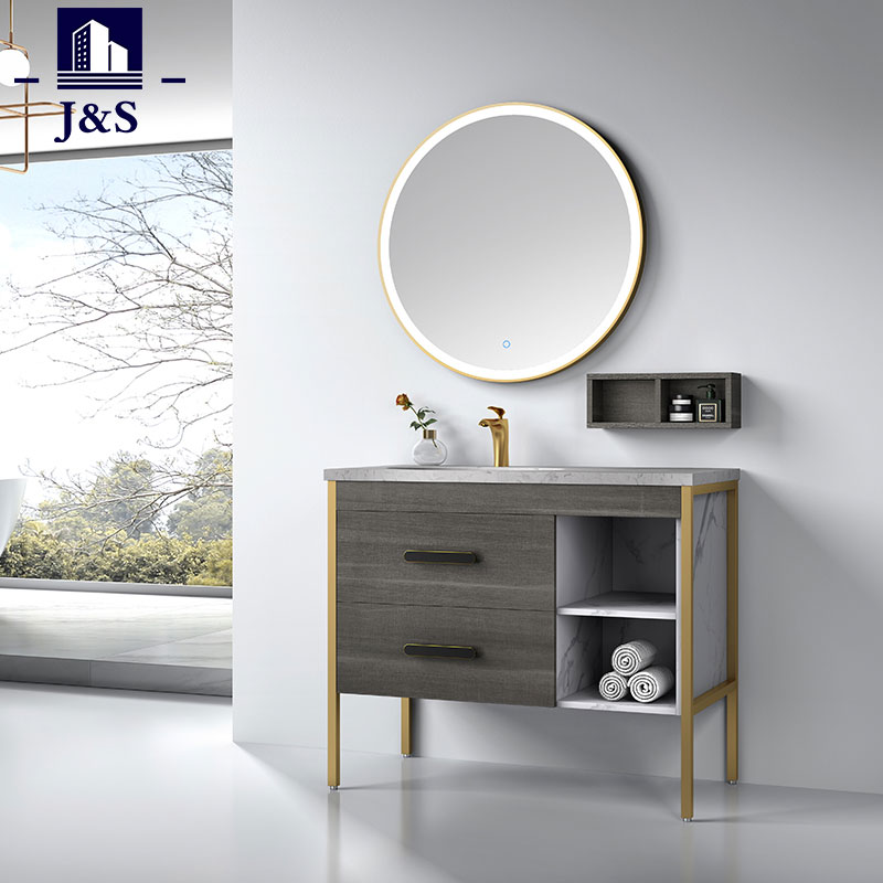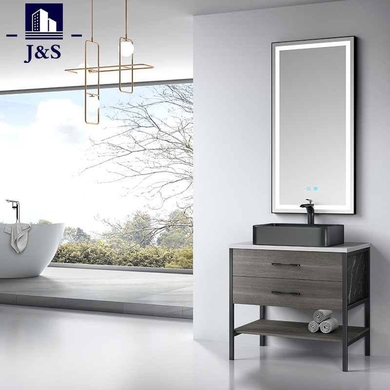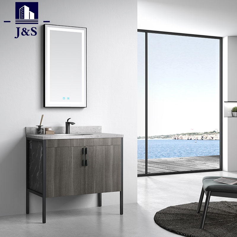 Mag-supply ang J&S ng Modern Rustic Bathroom Cabinet Sets Corner. Ang disenyo ng bathroom vanity na ito na sinamahan ng aluminum frame, Plywood cabinet body, tandem box drawer runner, quartz top ang magiging durbale at mas matibay na materyal para sa vanity. Mirror hanging meet customer' need.