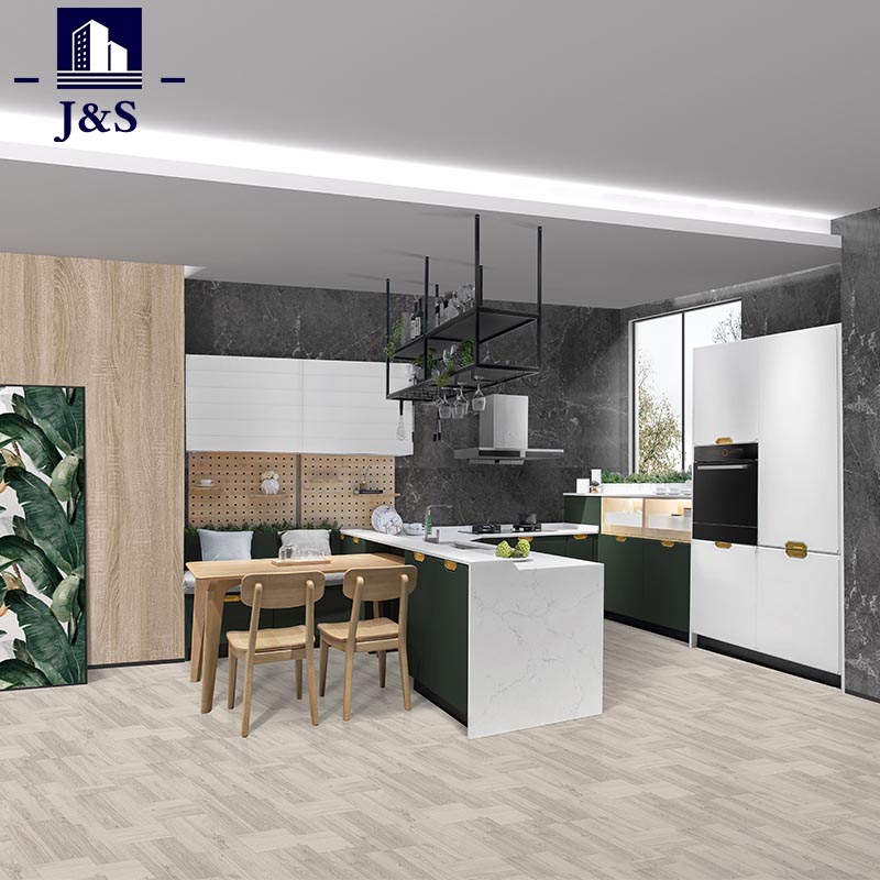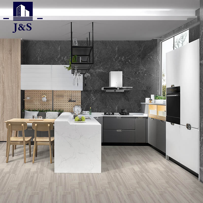 J&S supply Bagong disenyo na matt white kitchen cabinet,ito ay acrylic finished door kitchen cabinet.Ginagamit ang acrylic door panels para sa magandang transparency, dahil ang ganitong uri ng door panels ay gawa sa walang kulay at transparent na plexiglass plate, at ang light transmittance nito ay maaaring umabot ng higit sa 92 %, pagkamit ng mirror effect at biswal na pagpapalawak ng espasyo sa kusina.